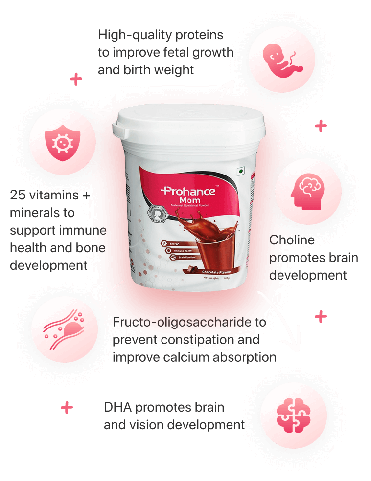 Prohance Mom contains high-quality proteins [milk protein—skimmed milk powder (casein protein 70%) and whey protein (30%)]. It aids digestibility and high biological value. It also contains DHA, which is well-known for brain function support. Prohance Mom is free from trans-fatty acids.
